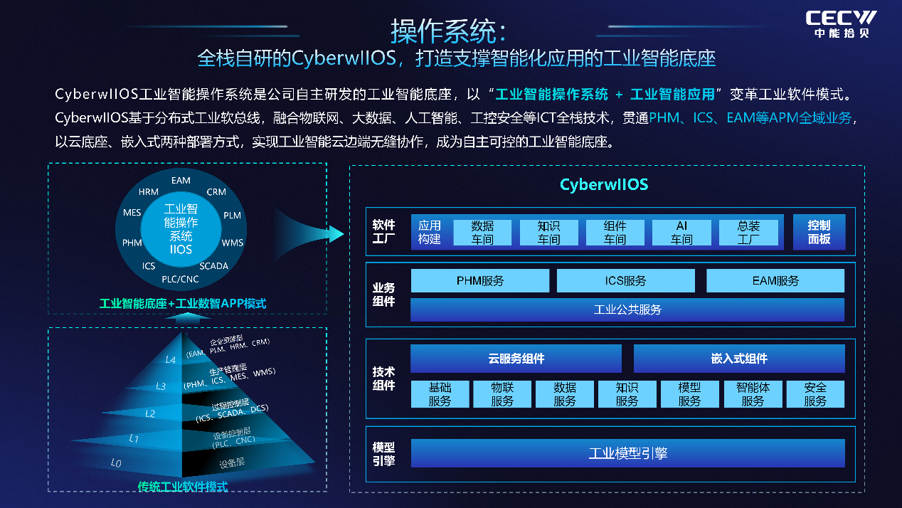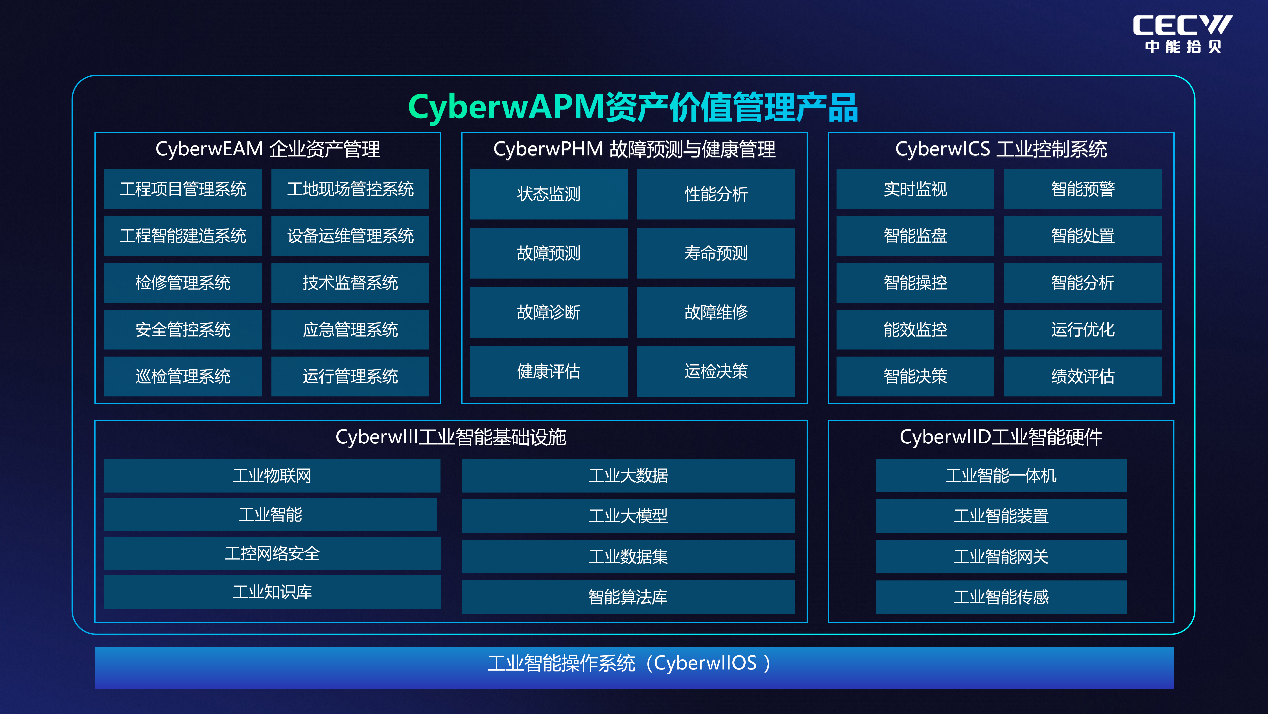 基于CyberwIIOS拾贝工业智能操作系统,聚焦APM领域完成了CyberwPHM、CyberwEAM、CyberwICS、CyberwIII、CyberwIID五大核心居品的全面进步。这不仅是单一居品的迭代,更是构建了隐敝“端侧硬件—边际蓄意—平台软件—场景诳骗”的APM全栈居品体系,杀青了从底层截止到表层决策的有机长入。